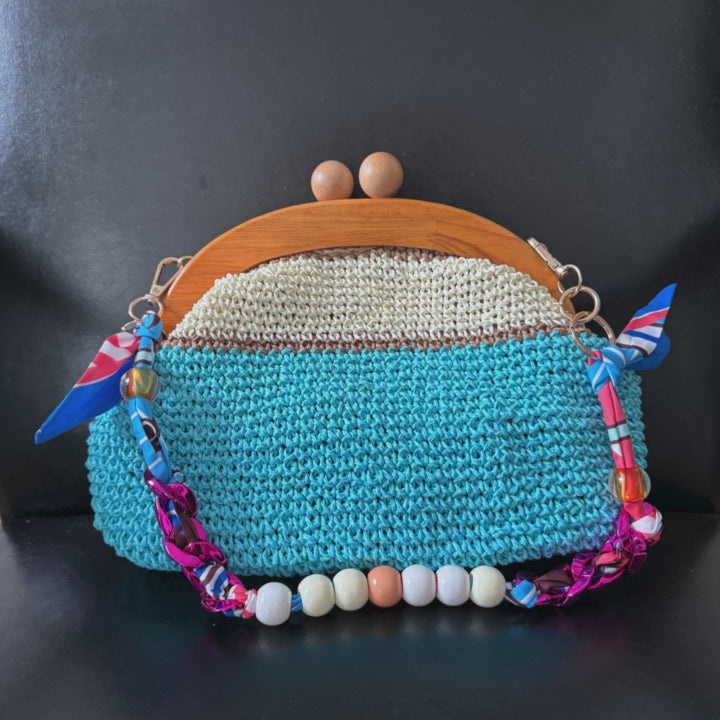 Elevate your summer look with this beautifully handcrafted bag from Turkey. Made with premium yarn, a natural wood frame, and a colorful beaded strap for a unique touch.